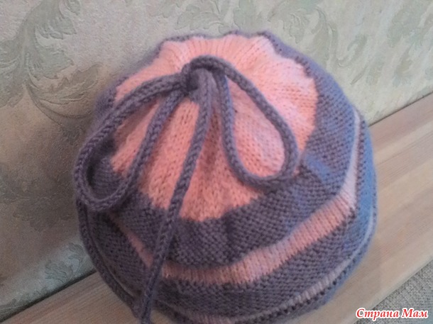 Здесь вместо помпона я использовала два шнура, которые вязала спицами на 3 петлях. Вязать их необычайно легко, быстро и просто. Вот здесь всё хорошо написано о шнурах спицами https://www.stranamam.ru/post/4262076/.