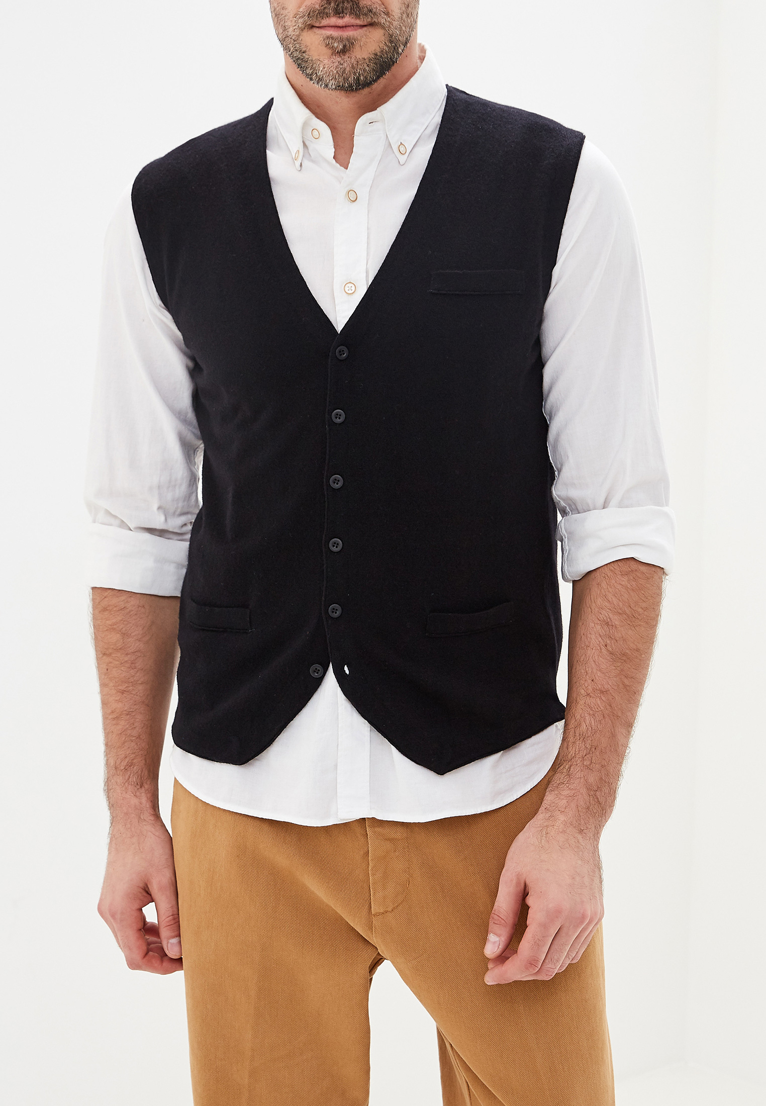 Классический однотонный трикотажный жилет с V-образным вырезом горловины от Fine Joyce. Отлично будет смотреться с рубашкой.