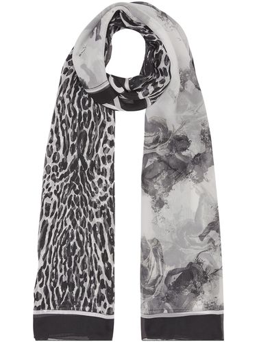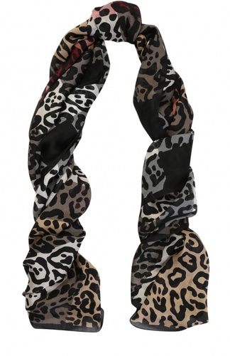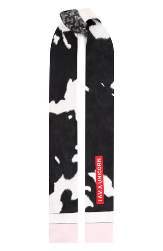 Черно-белый двусторонний шарф из тонкого мягкого шелка можно носить на шее или освежить внешний вид любимой сумки: достаточно просто повязать аксессуар на ручку. Изделие украсили крупным анималистичным принтом и паттерном с эмблемой бренда. Состав: Шел.