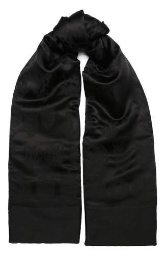 Черный шарф гармонично дополнит как повседневный, так и офисный образ. У модели минималистичный декор: только едва заметный геральдический узор, в основу которого легли рисунки из архива бренда. Фактурный орнамент создали с помощью сложного переплетения.