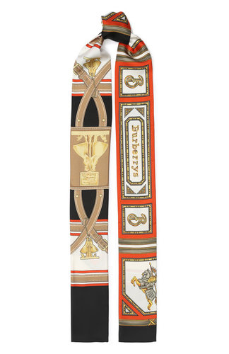 Узкий шарф с принтом, выполненным по архивным эскизам, может стать ярким акцентом в образе. Для создания модели мастера бренда использовали мягкий шелковый твил с характерным блеском. Материал не деформируется со временем, потому изделие прослужит долго.