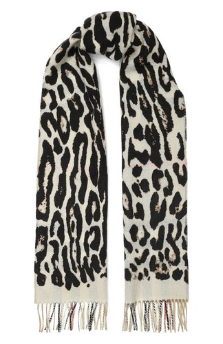 Кашемировый шарф в клетку от Burberry (Берберри). Края с бахромой и леопардовый принт.