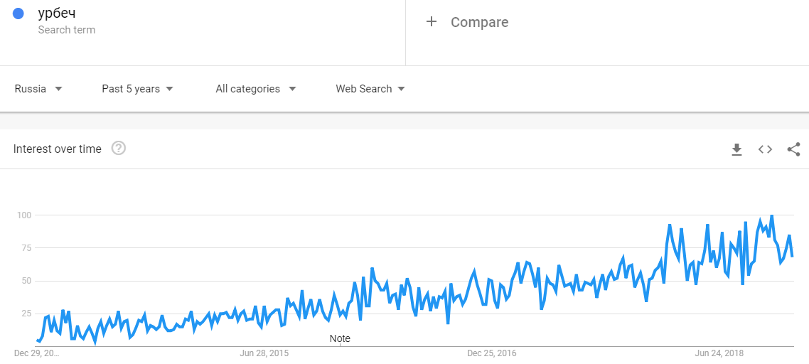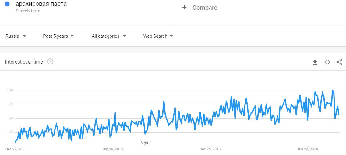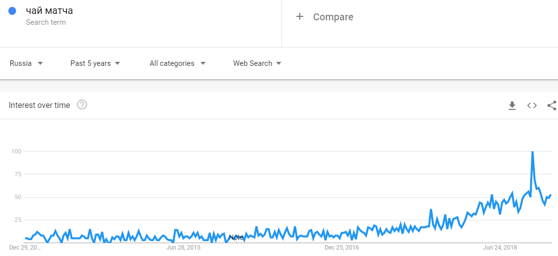 Матча богат антиоксидантами и полезными элементами, что быстро сделало его популярным напитком. В процессе производства листья зеленого чая измельчаются в порошок, что в итоге повышает концентрацию полезных веществ в напитке. Как видно по графику Google Trends, интерес к чаю матча уже не находится на пике, но все еще остается высоким: