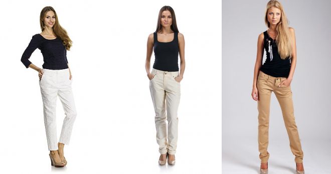 Выбирая бежевые брюки, останавливайтесь на немного расклешенных моделях. Чересчур обтягивающие дудочки будут выглядеть вульгарно, издалека может показаться, что вы не одеты. Цвет темная слоновая кость уместен в аристократичном варианте хлопчатобумажных брюк с небольшим добавлением стрейча длиной семь восьмых со стрелками. Сочетать их можно как с кристально белыми блузами, так и более ярким верхом.