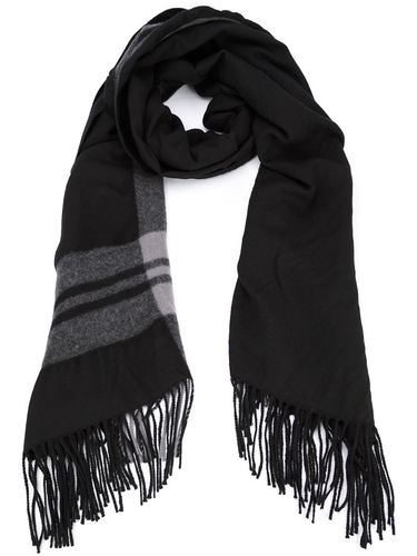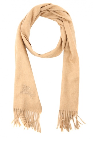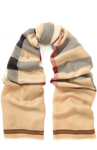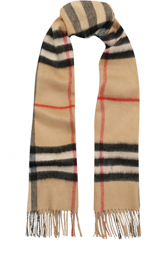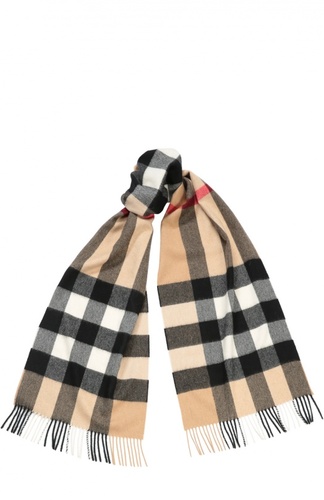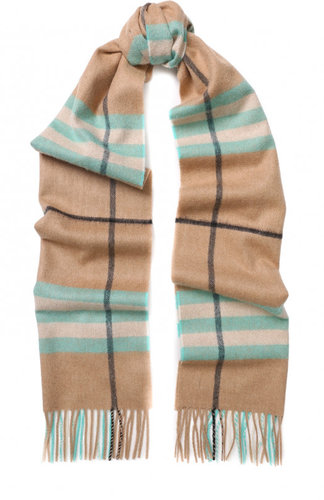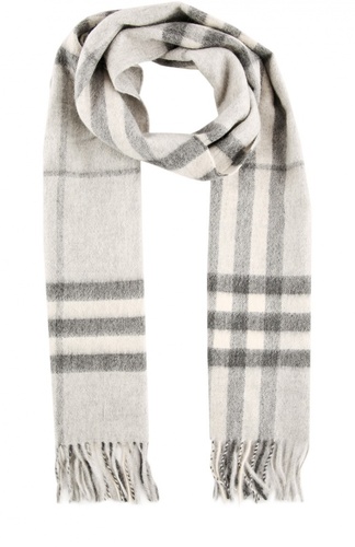 Шарф из мягкого кашемира в темно-серую клетку, ставшую знаковой для марки. Края украшены бахромой. Модель из классической коллекции бренда, основанного Томасом Берберри. Для производства шарфа использовала шерсть, прошедшая специальную обработку на ферм.