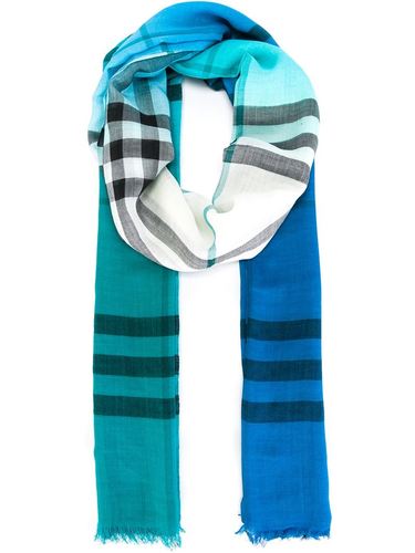Голубой с синим шелково-шерстяной шарф в клетку от Burberry.