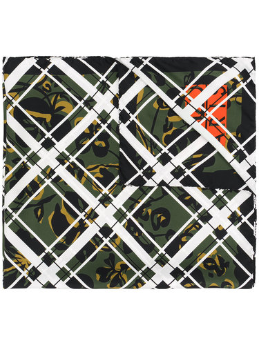 Зеленый шелковый шарф в клетку от Kenzo(Кензо). Микс орнаментов.