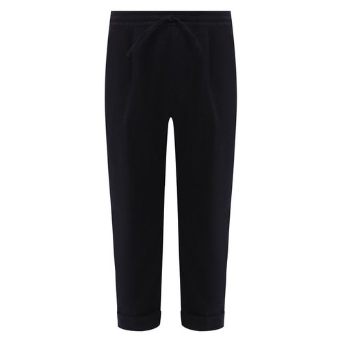Укороченные темно-синие брюки с широкими отворотами и поясом-кулиской зададут расслабленное настроение образу. Для создания модели из осенне-зимней коллекции 2019 года Джорджио Армани выбрал мягкую хлопковую бумазею. Бархатистый на ощупь прочный материа.
